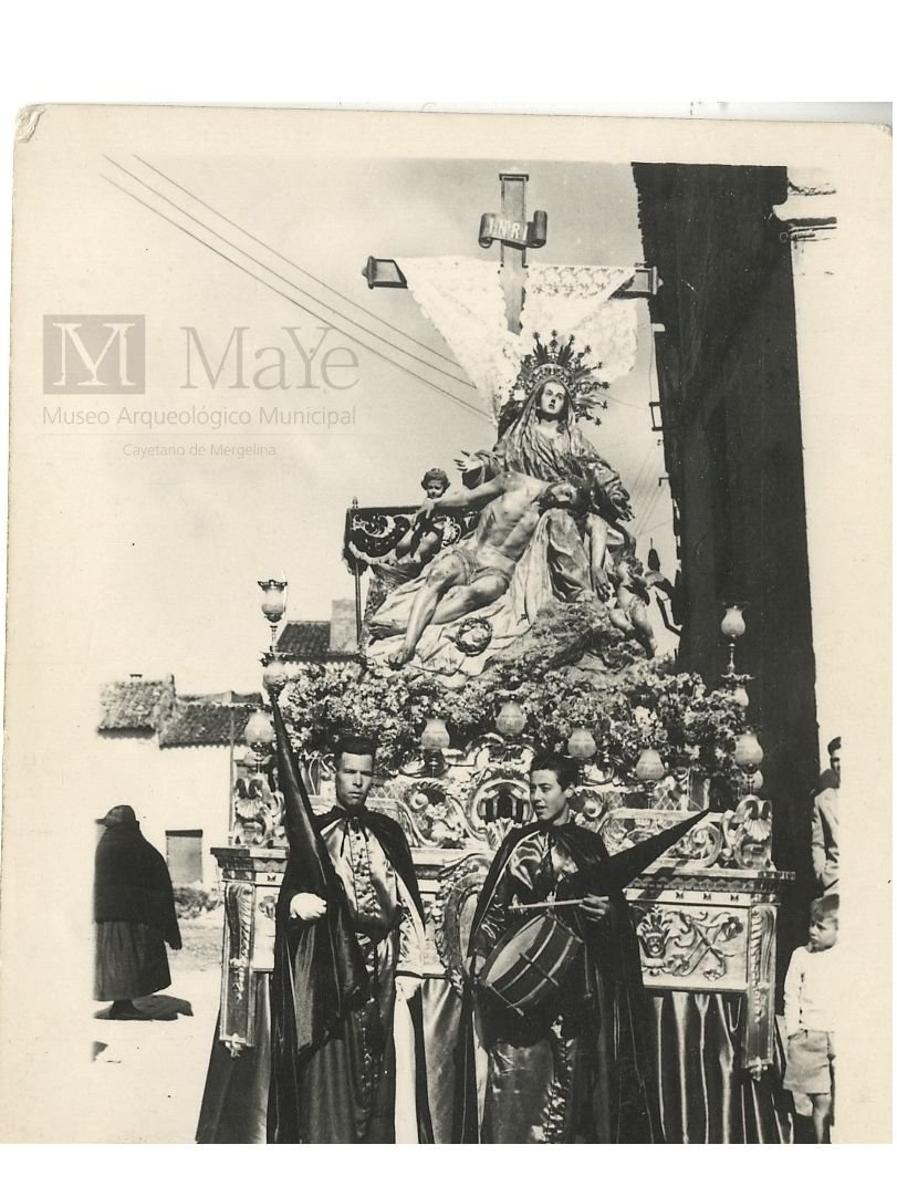 Comentario: En esta fotografía se muestra la imagen de la Virgen de las Angustias, realizada por Francisco Salzillo en 1763-1764 para la VOT de Yecla. Podemos ver el estado de conservación de la imagen en esos momentos, además del estreno de la nueva indumentaria de esta Hermandad.