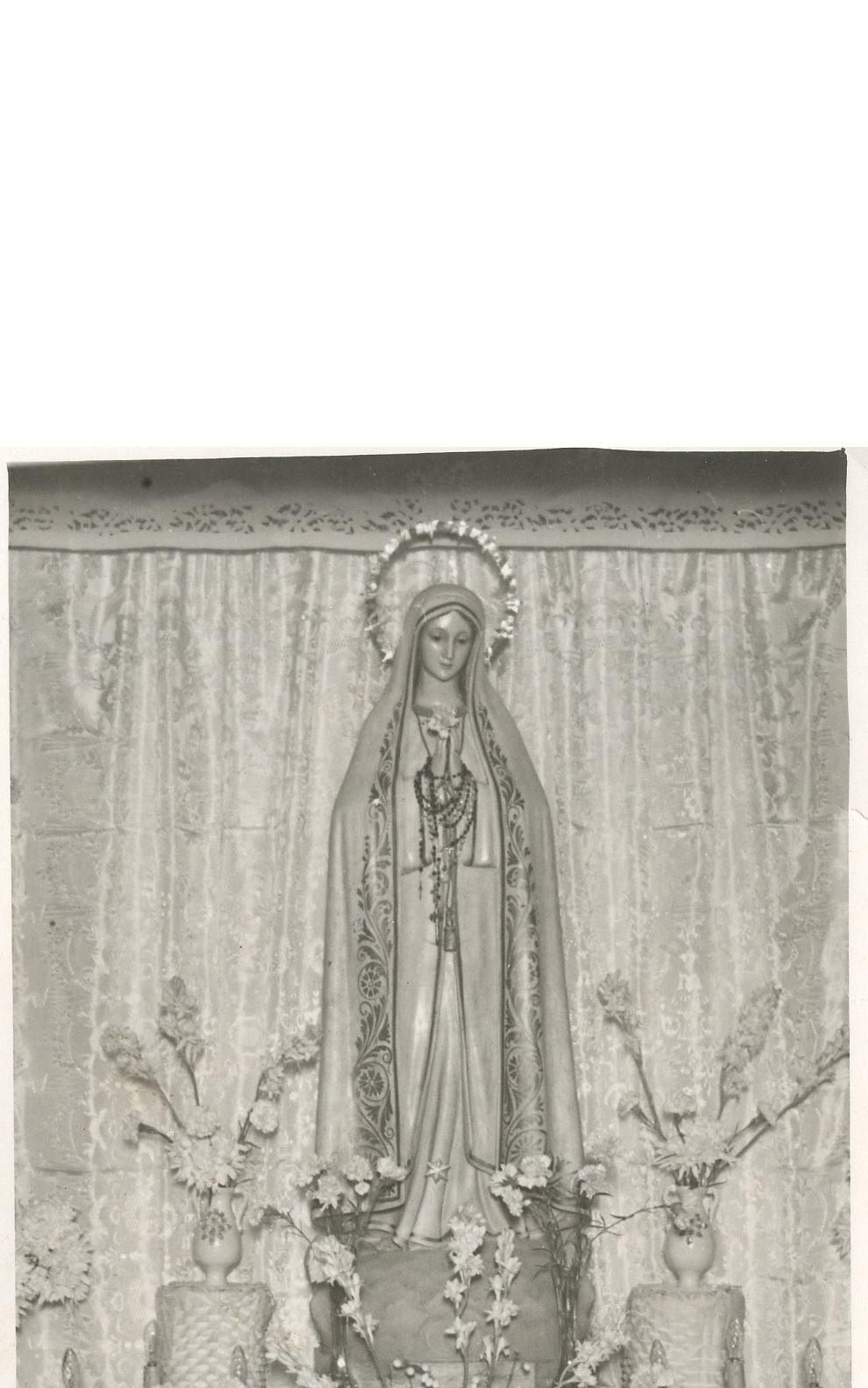Comentario: Era común durante el pasado siglo que algunas imágenes devocionales fueran visitando los hogares de los diversos miembros de una congregación. En esta fotografía podemos ver una de esas esculturas itinerantes durante su estancia en algunos hogares de Yecla.