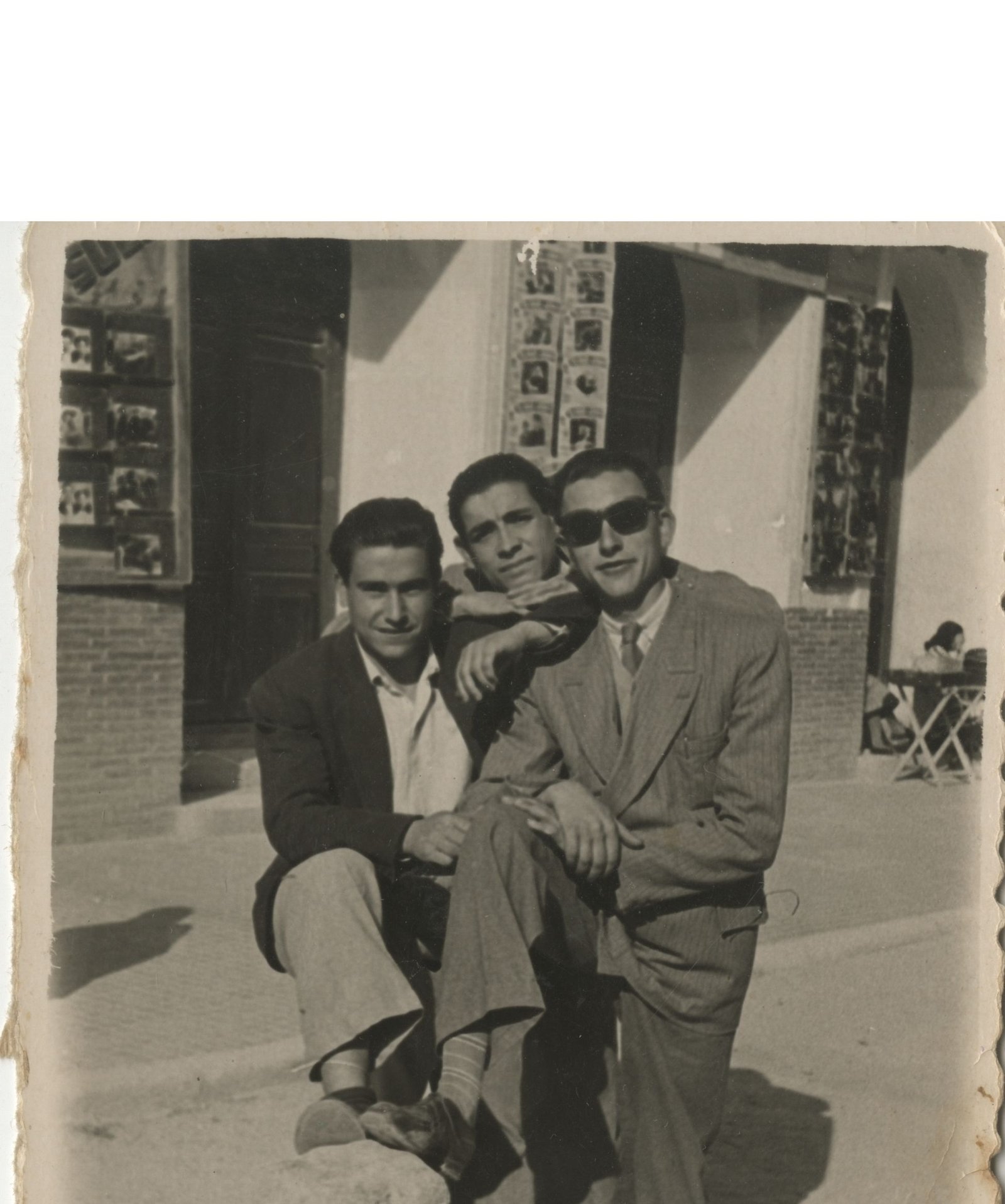 Comentario: En esta imagen podemos ver a un grupo de amigos en la puerta de un cine. Al fondo de la misma se observan los fotogramas de pasadas y futuras proyecciones cinematográficas.