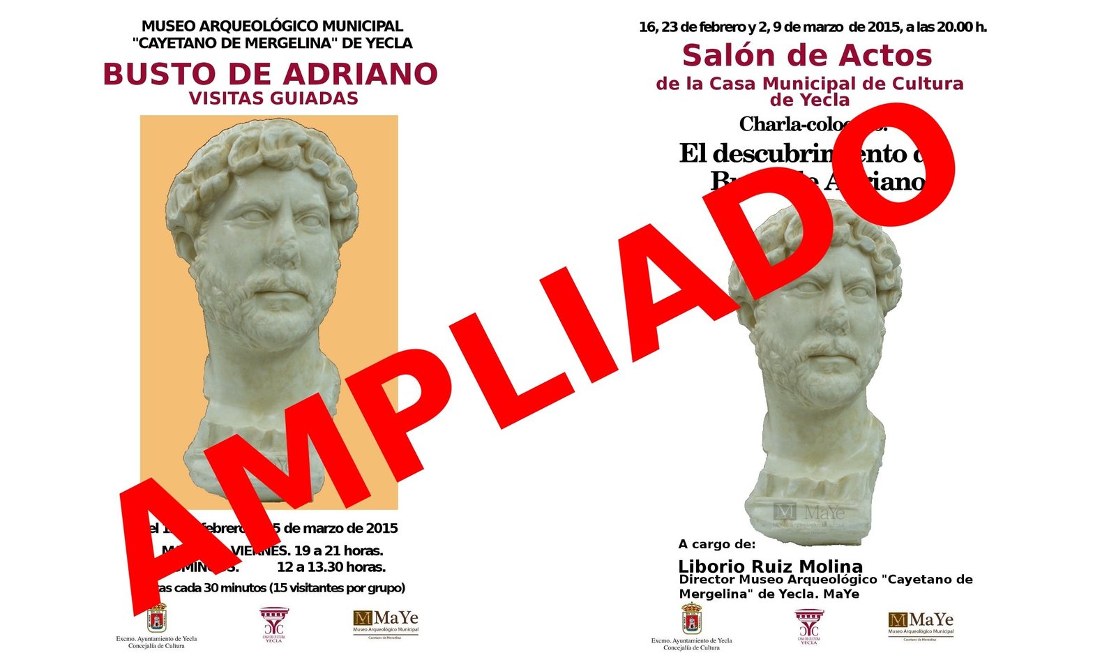 Ampliadas las Jornadas de puertas abiertas para conocer el busto de Adriano en el Museo Arqueológico Municipal «Cayetano de Mergelina» de Yecla. Estas jornadas vienen consistiendo por una parte, en visitas guiadas hasta el próximo 29 de marzo; y de otra, una charla-coloquio sobre el descubrimiento del busto de Adriano.