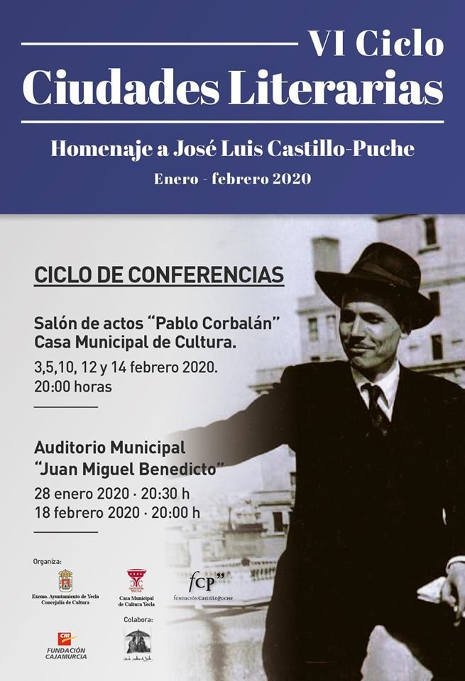 Un año más, y esta la sexta edición, vamos a celebrar el Ciclo Ciudades Literarias en homenaje a nuestro escritor José Luis Castillo-Puche (Yecla, 1919- Murcia, 2004). Con él también celebramos el centenario de su nacimiento. El programa de actos que os adjunto principia el próximo martes 28 de enero y finaliza el día 18 de febrero.